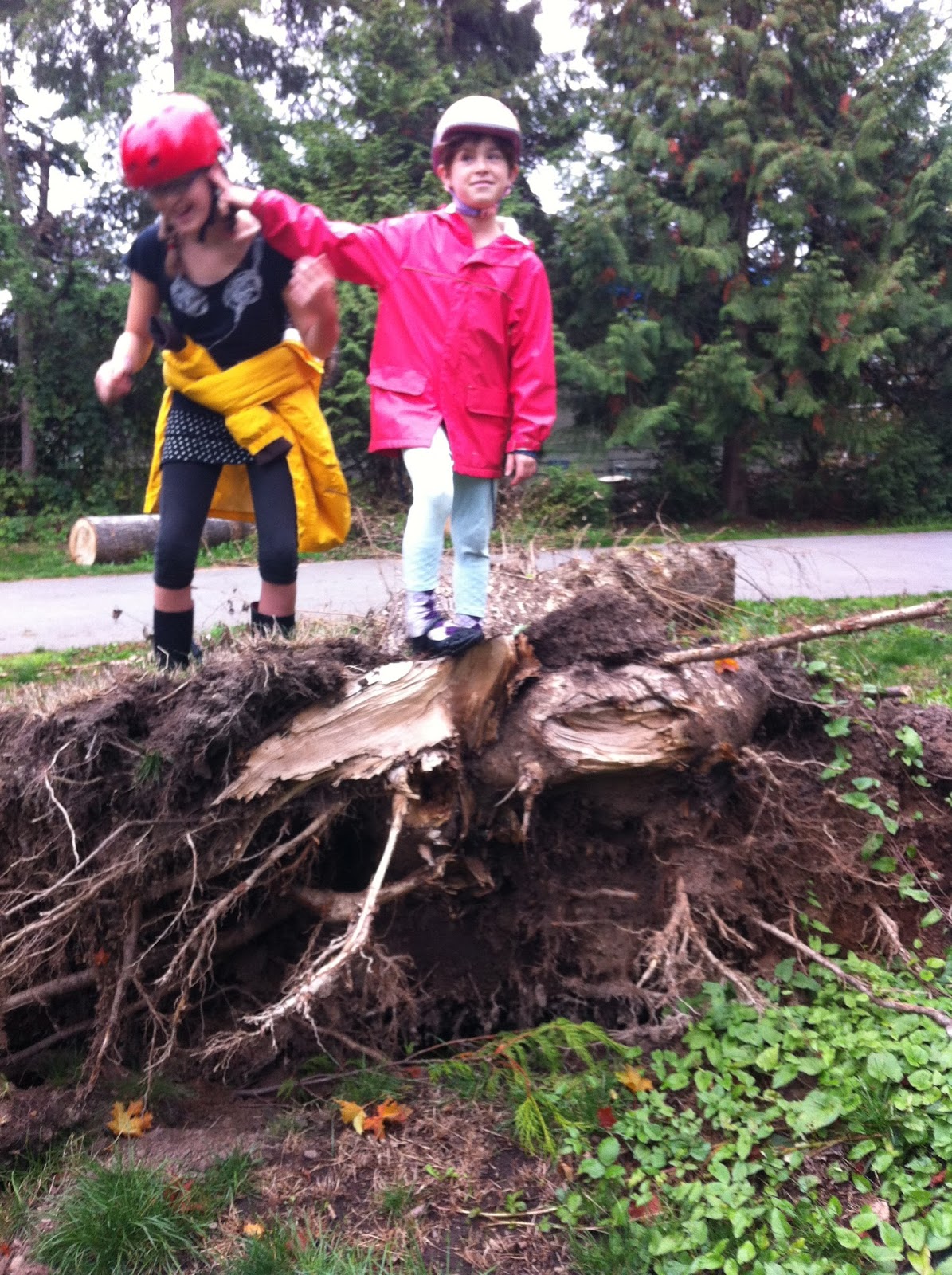 This is a tree which has been uprooted. This was not the only tree which we saw uprooted in our neighbourhood, there were about 3-5 trees we saw like his after the wind storm. The reason why all these trees which which are very supportive was that in the past when we had wind storms, there usually weren't droughts before that. But this summer there was a drought right before the windstorm so all of the roots were dry, and not strong. So that's why when the windstorm came tree branches and trees fell over like crazy. This part where my foot is, is a massive, massive, massive tree root where it just snapped!